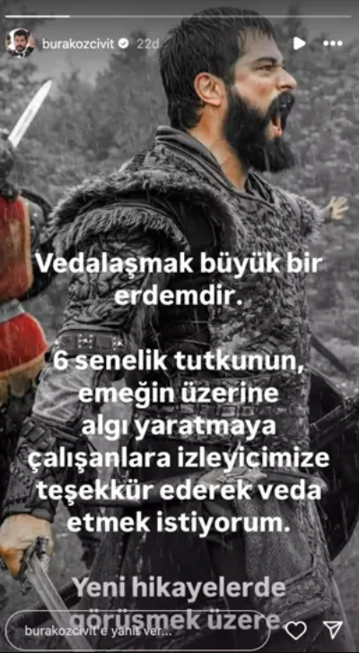 Dizide 6 sezondur Osman Bey’e hayat veren Burak Özçivit “Algı yaratmaya çalışanlara veda etmek istiyorum.” diyerek şu paylaşımı yaptı: